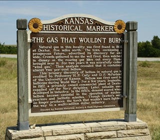 Natural gas in this locality was first found in 1903 at Dexter, five miles north. The town, envisioning a prosperous future, advertised its discovery far and wide. Crowds gathered to see the well fired, then watched in dismay as the roaring gas blew out every flame brought near it. For two years it was scornfully called "wind gas". Then analysis revealed that it contained almost two per cent helium.
